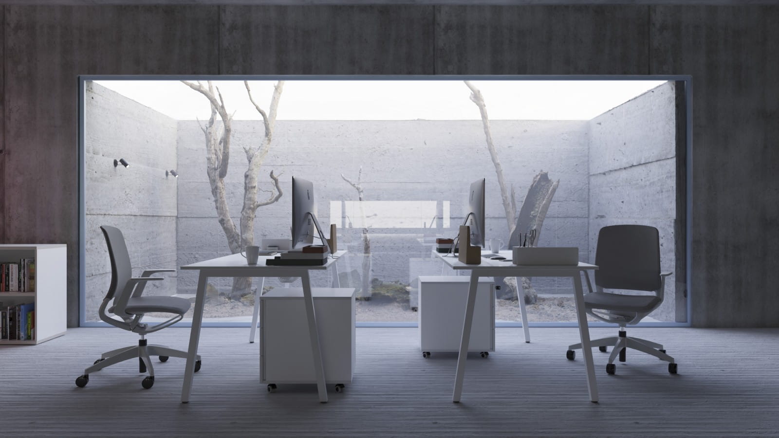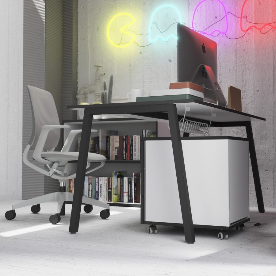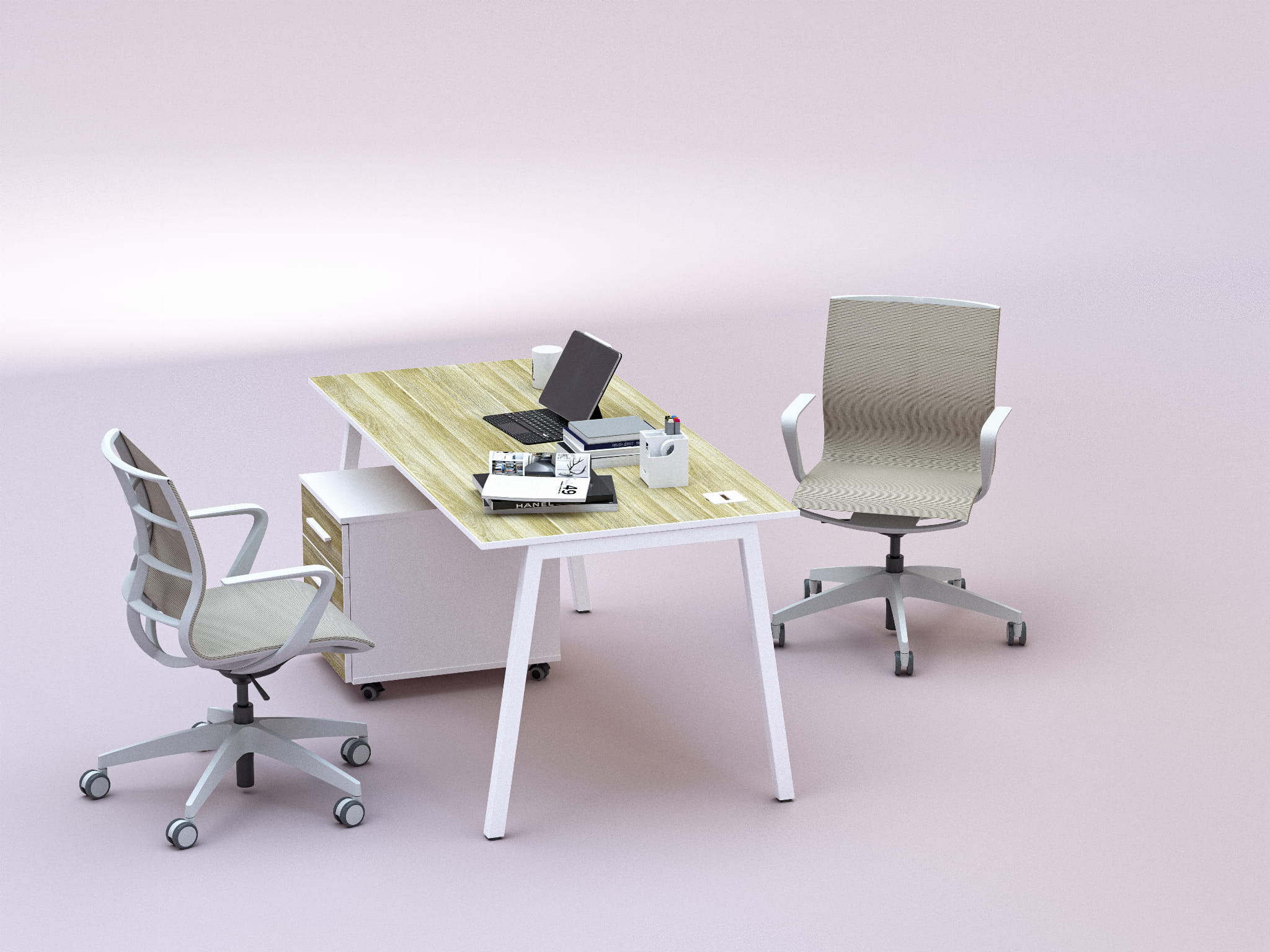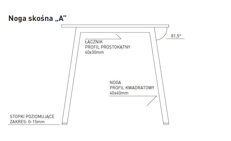 Meble biurowe - blat biurka wykonany jest z płyty trójwarstwowej o grubości 18mm pokrytej melaminą . Krawędzie oklejone obrzeżem ABS 2mm. Blat skręcany do stelaża za pomocą śrub metrycznych M6 w gniazda stalowe zamocowane w blacie, co pozwala na wielokrotny demontaż elementów. Noga biurka wykonana ze stali, z profilu 40x40mm Nogi połączone trawersem wykonanym ze stali o przekroju 40x25mm. Stelaż skręcany za pomocą czterech śrub M8, z gwintem metrycznym. Noga biurka malowana proszkowo - zakres poziomowania 1,5cm