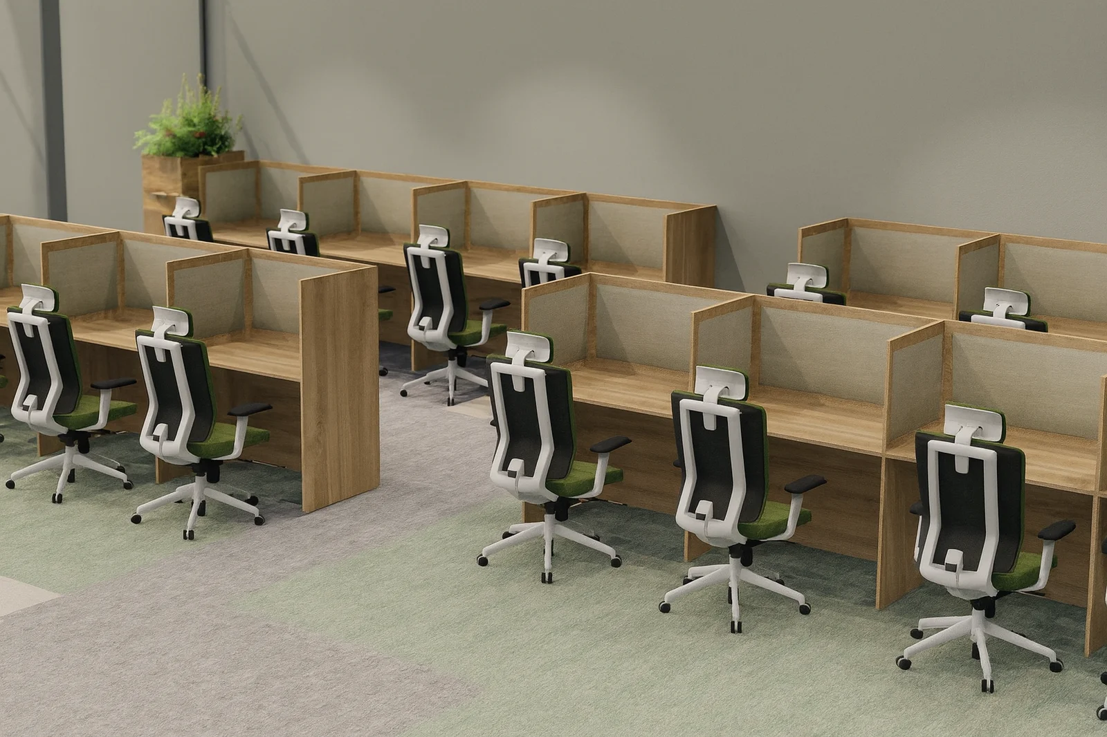 Modułowe stanowiska call center pozwalają na ekonomiczne zagospodarowanie przestrzeni biurowej zarówno w niewielkich pomieszczeniach jak i dużych powierzchniach typu open-space.