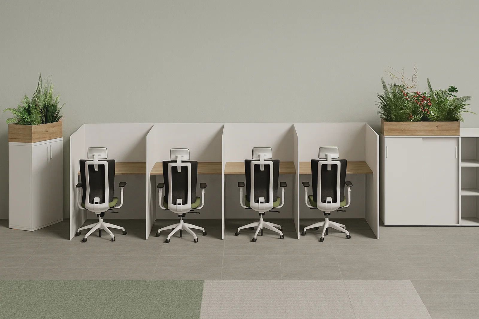 Modułowe stanowiska call center pozwalają na ekonomiczne zagospodarowanie przestrzeni biurowej zarówno w niewielkich pomieszczeniach jak i dużych powierzchniach typu open-space.