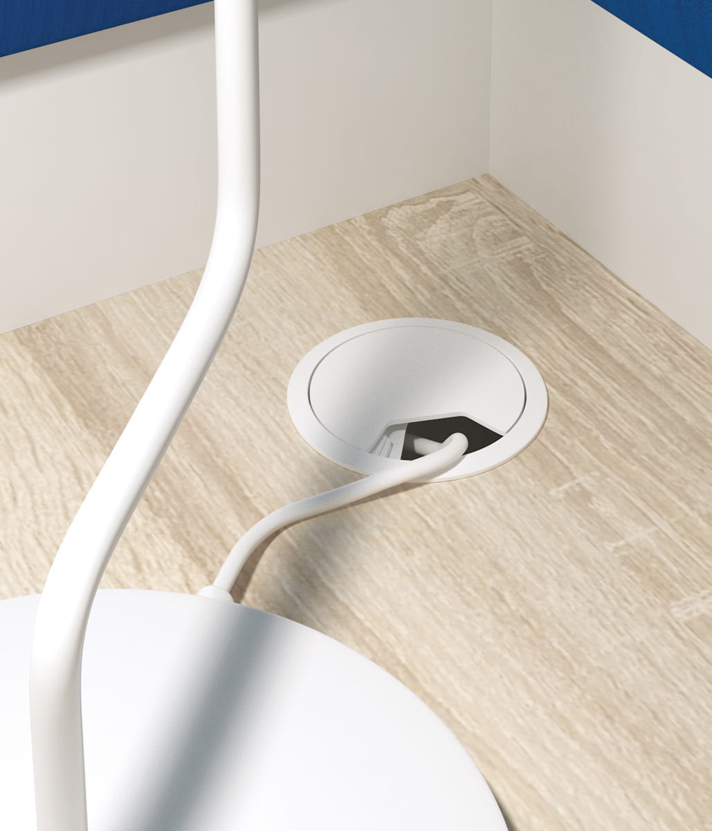 Standardowo blat roboczy niezależnie od wielkości wyposażany jest w dwa przeloty kablowe fi 60mm, przegroda boczna również wyposażona jest w dwa przeloty.