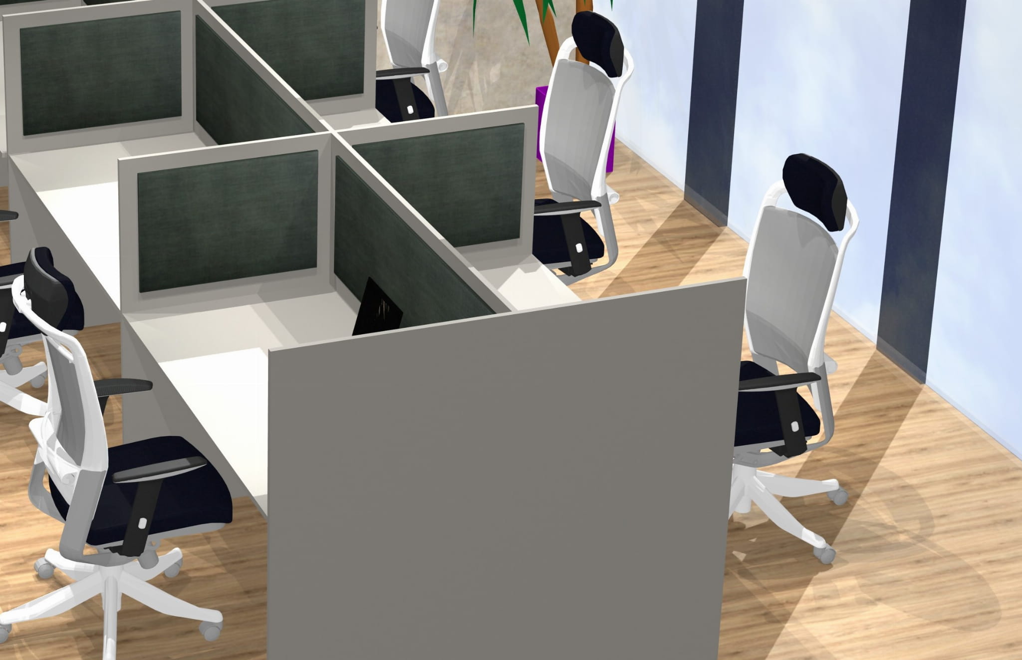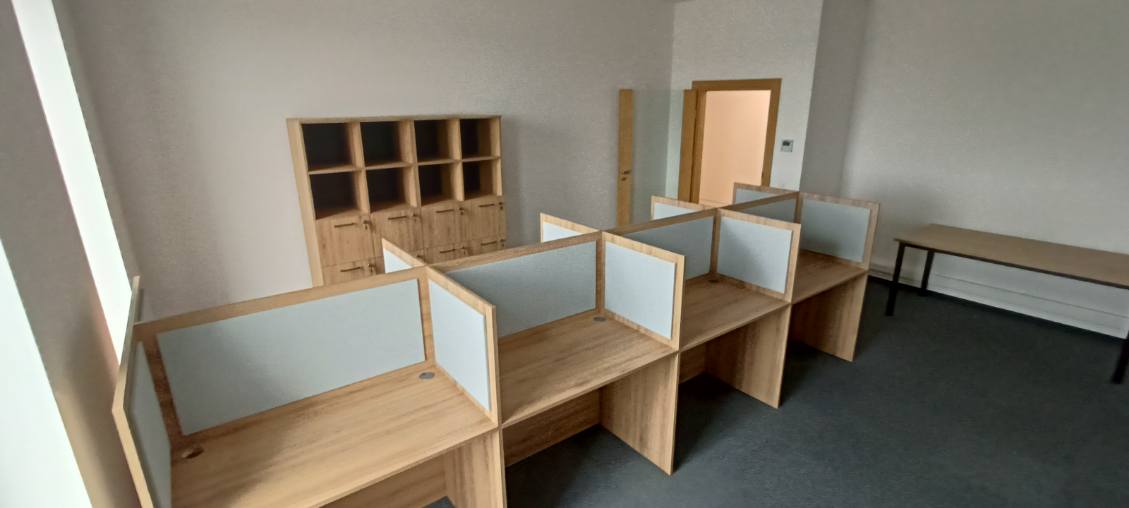Boksy call center mogą być modyfikowane wg wytycznych klienta. Częstą modyfikacją jest wydłużenie ścianek bocznych względem blatu. Takie rozwiązanie przedstawiamy poniżej, jest to zdjęcie z naszej realizacji.