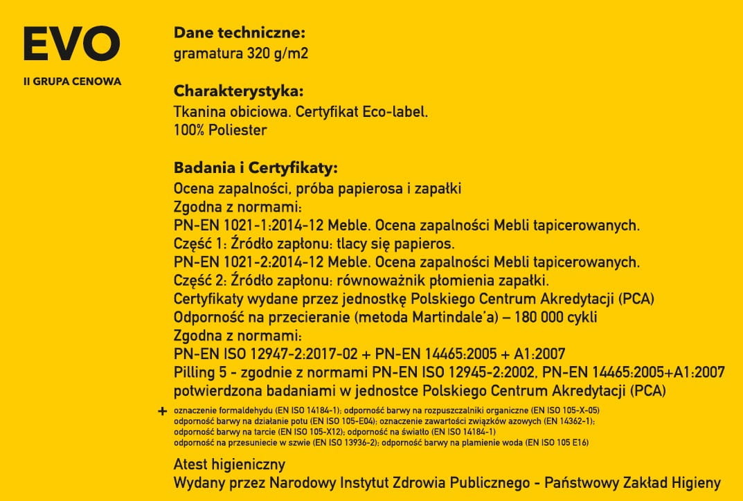 Tkaniny posiadają: Atest Higieniczny PZH, Certyfikat Laboratorium Badawczego akredytowanego przez Polskie Centrum Akredytacji w zakresie badań odporności