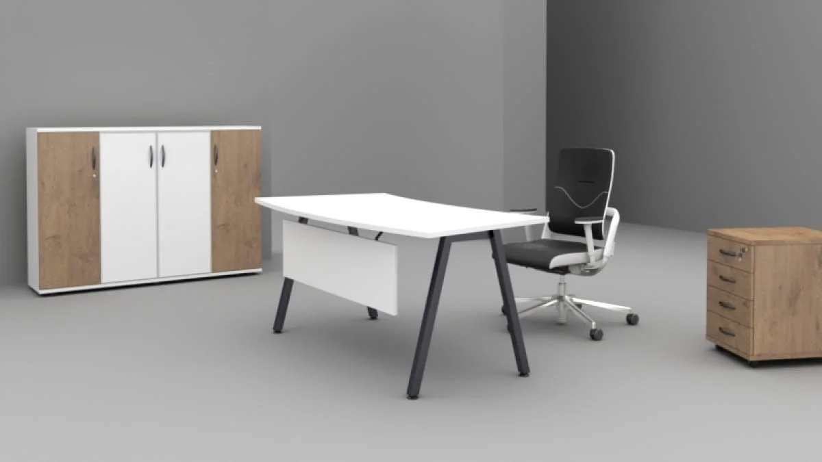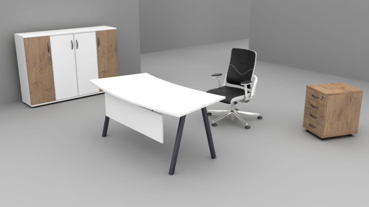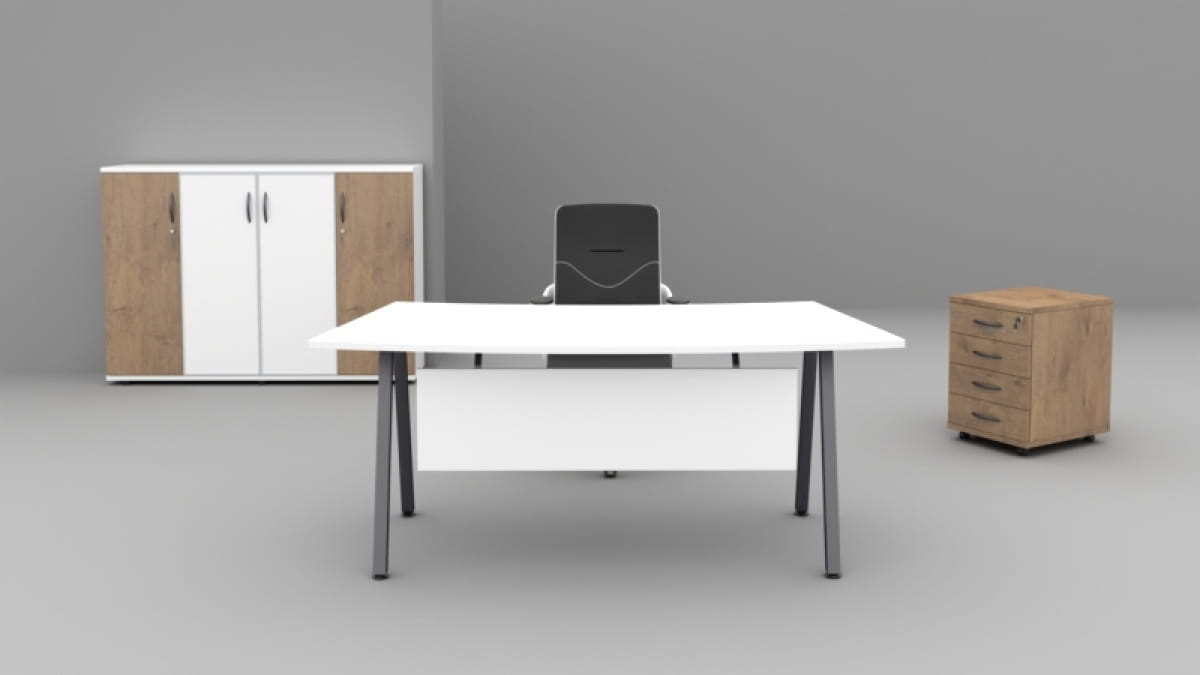 Zestaw mebli gabinetowych A-055/K to propozycja dla osób, które cenią elegancję, styl i funkcjonalność w swoim gabinecie. Przyciągające uwagę linie i lekka forma biurek nadają charakteru miejscu pracy, a skośny stelaż oraz bogata kolorystyka (dostępność wielu wersji blatów, stelaży i szkła) pozwalają idealnie dopasować zestaw do wnętrza.