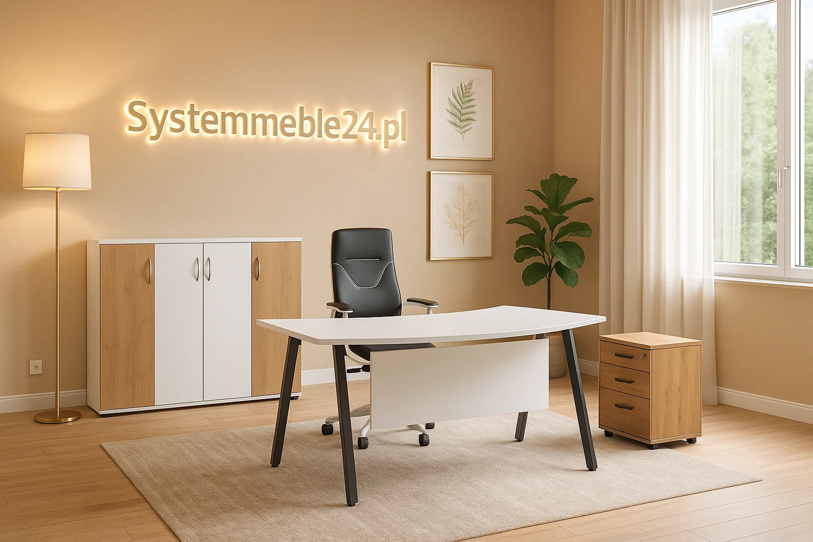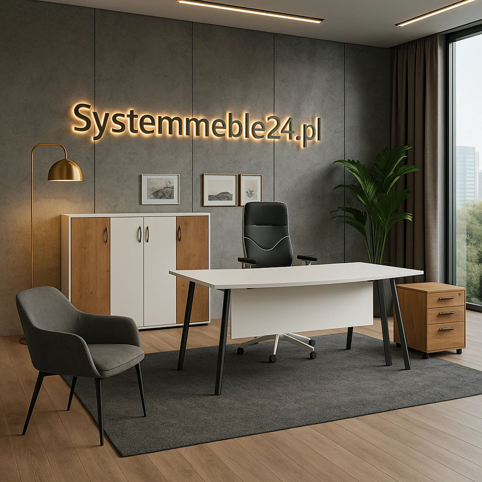 W komplecie znajduje się kontener biurowy z 4 szufladami i zamkiem centralnym oraz komoda gabinetowa ze szkłem lakierowanym – co czyni zestaw praktycznym i eleganckim. Zestaw A-055/K to meble, które wyróżniają się wysoką jakością wykonania i dbałością o detale, dlatego sprawdzą się zarówno w nowoczesnych gabinetach managerskich, jak i w tradycyjnych biurach.